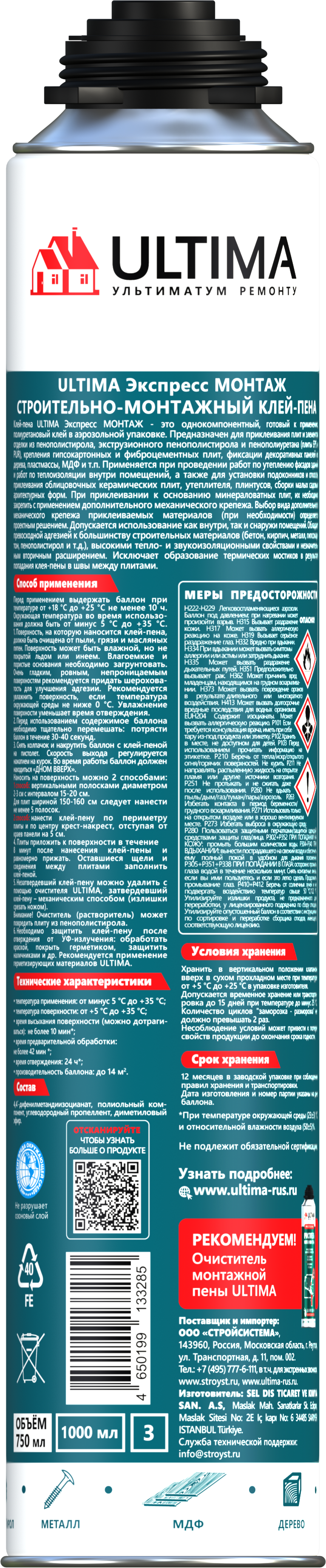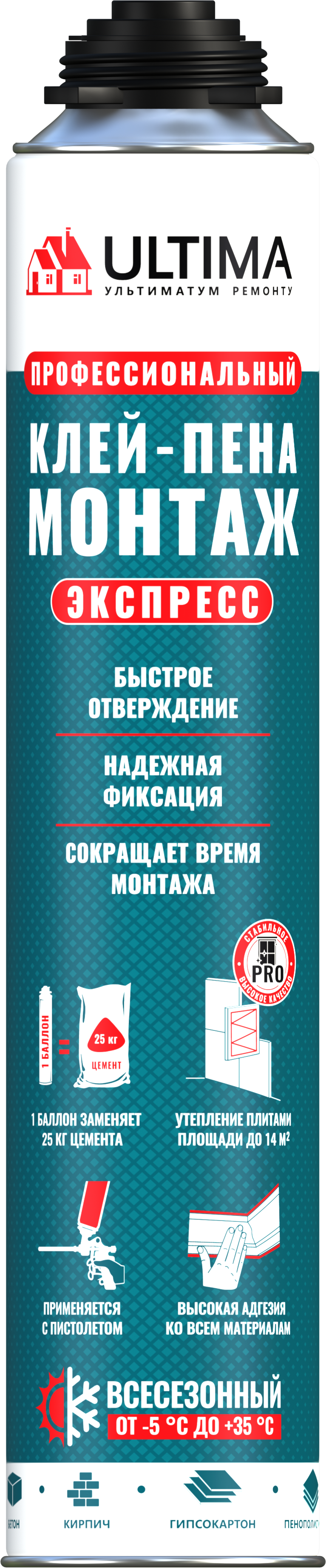 Клей-пена ULTIMA Монтаж - это однокомпонентный, готовый к применению, полиуретановый клей в аэрозольной упаковке. Полиуретановый клей-пена наносится при t от +5°C до +30°C при помощи монтажного пистолета, состав имеет низкое вторичное расширение и характеризуется превосходной адгезией, высокими тепло- и звукоизоляционными свойствами, прочным соединением, без термических мостиков в результате попадания клея-пены в швы между плитами и продувания. 1 баллон ULTIMA Express МОНТАЖ заменит 1 мешок сухой смеси (25кг), этого хватит на площадь до 14 м2.